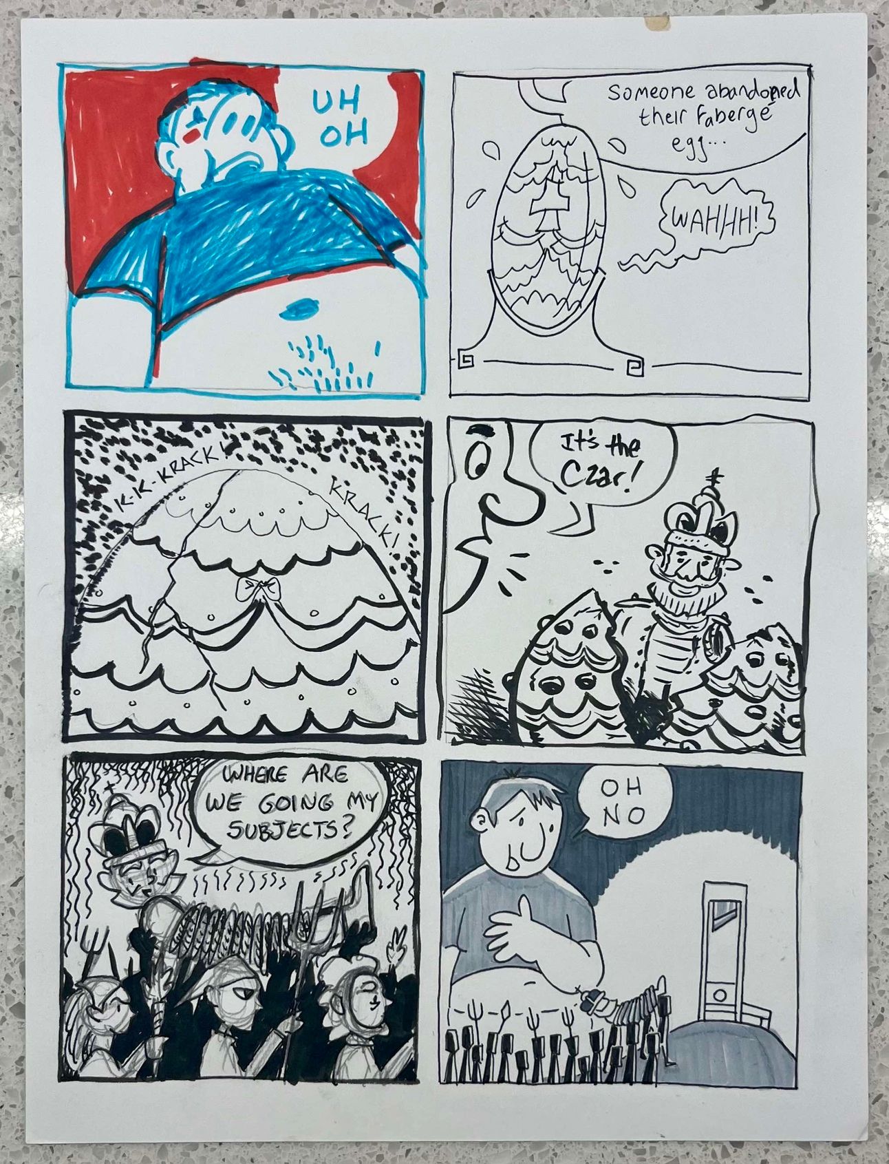 Jam comix in the “exquisite corpse” style where one artist draws a panel, then passes the page to someone else until the page is finished. (Write your name and the date on the back of the page so we know who drew what!)